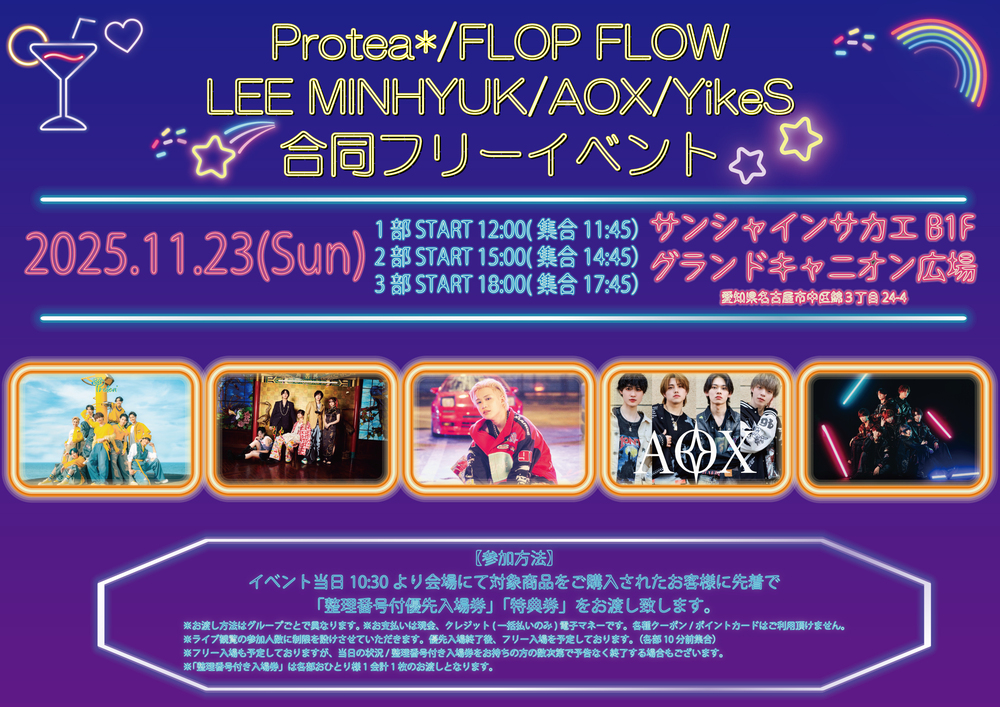 2025.11.23「合同フリーイベント」@サンシャインサカエグランドキャニオン広場出演決定!! SCHEDULE 2025/11/23(日) 10:30 - サンシャインサカエB1グランドキャニオン広場 地図を表示 2025.11.23「合同フリーイベント」@サンシャインサカエグランドキャニオン広場出演決定!! 「AOX」が名古屋の聖地、サンシャインサカエグランドキャニオン広場に戻ってきます!! あのステージにまた立たせていただくのが楽しみです🎶 URLをコピーする 報告する